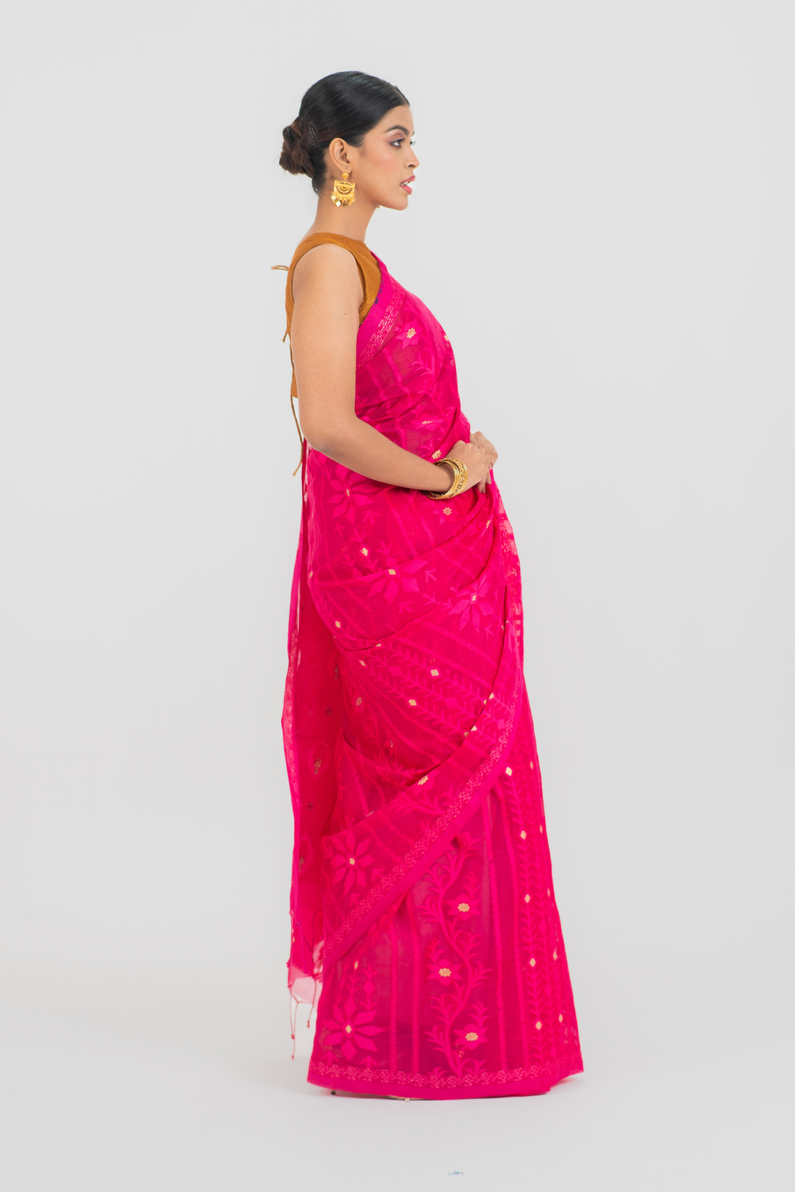 Stunning taat sari with delicate weaving and gold accents.