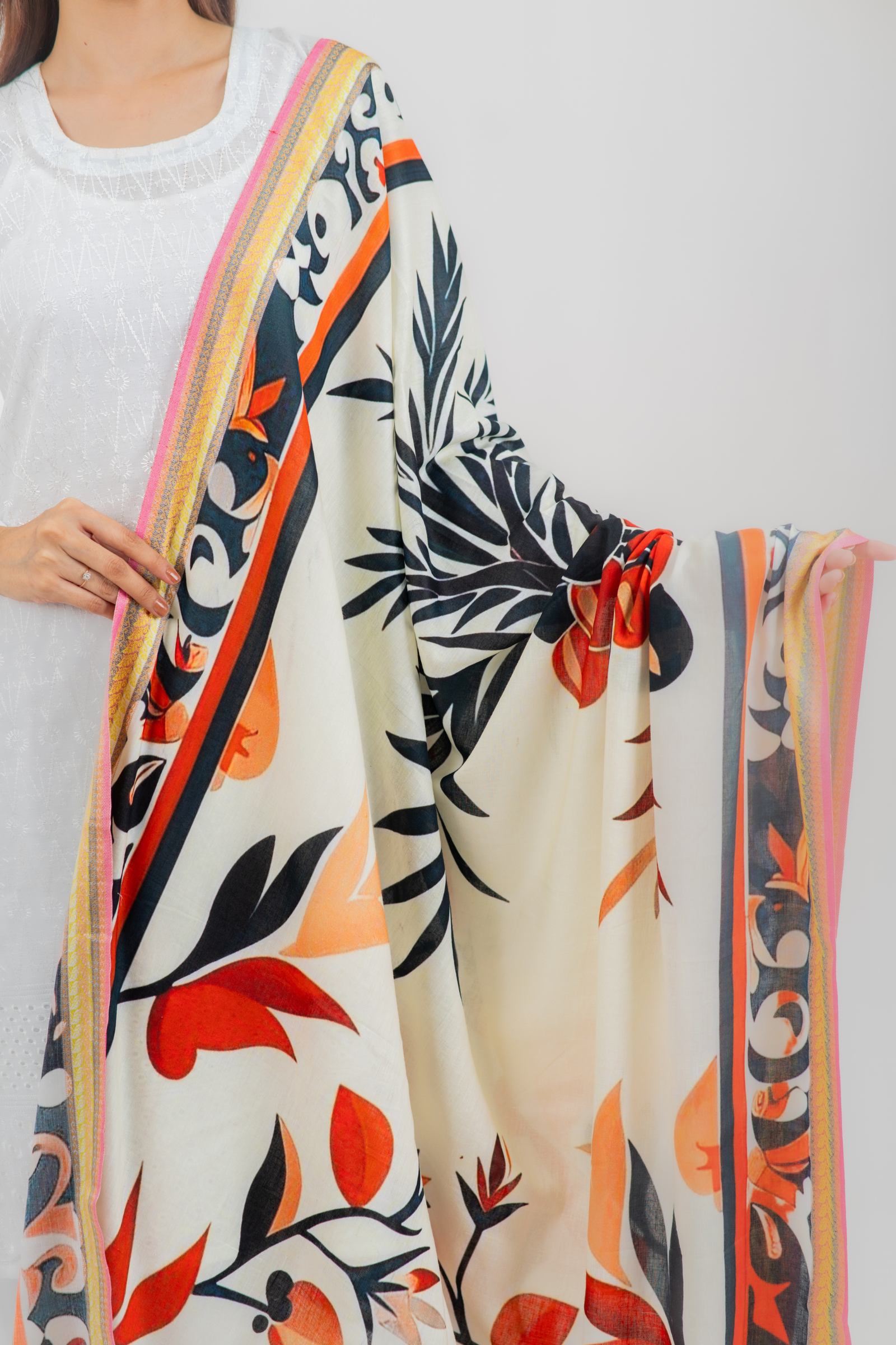 Gorgeous digitally printed orna on superfine tencel fabric with woven jacquard border.