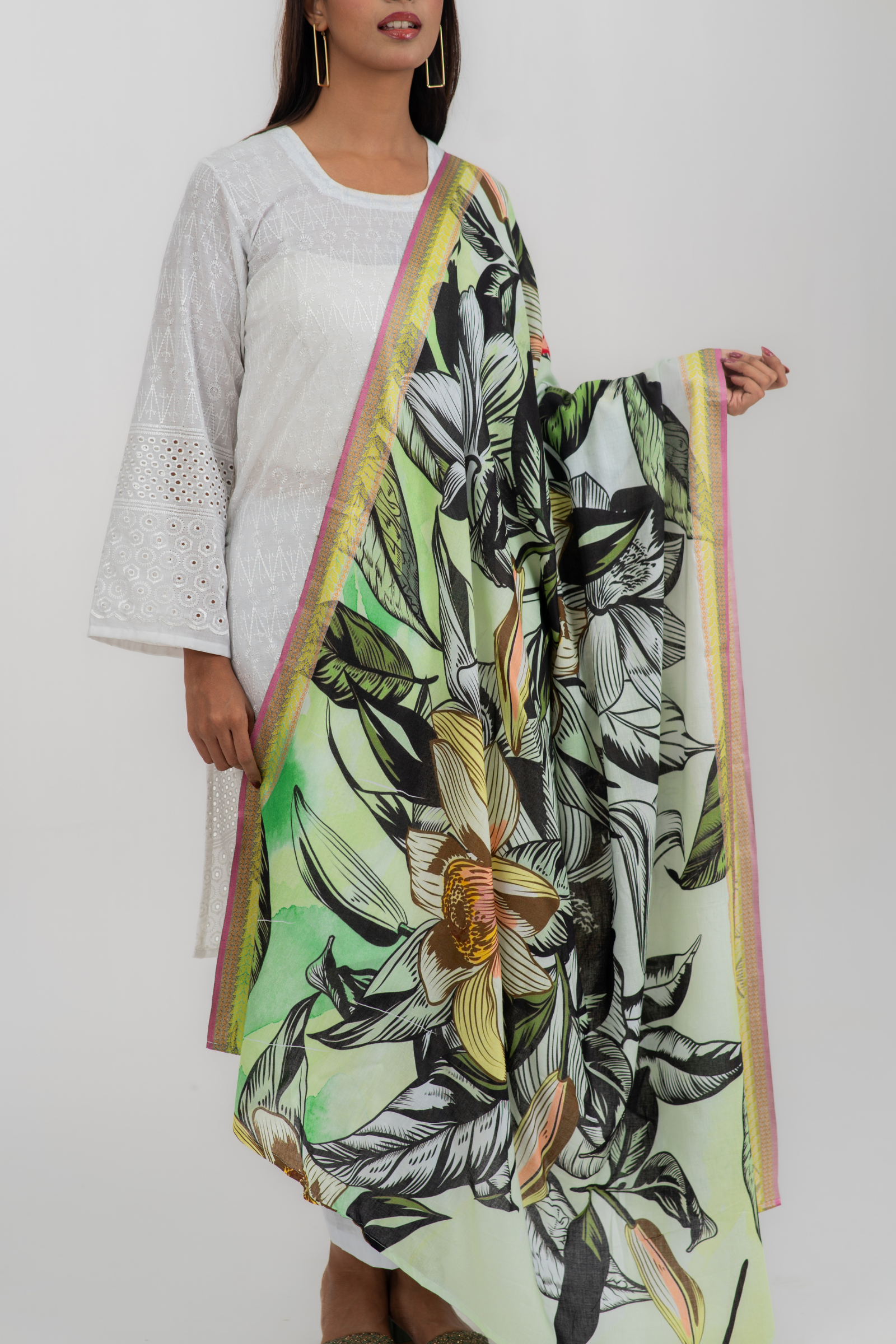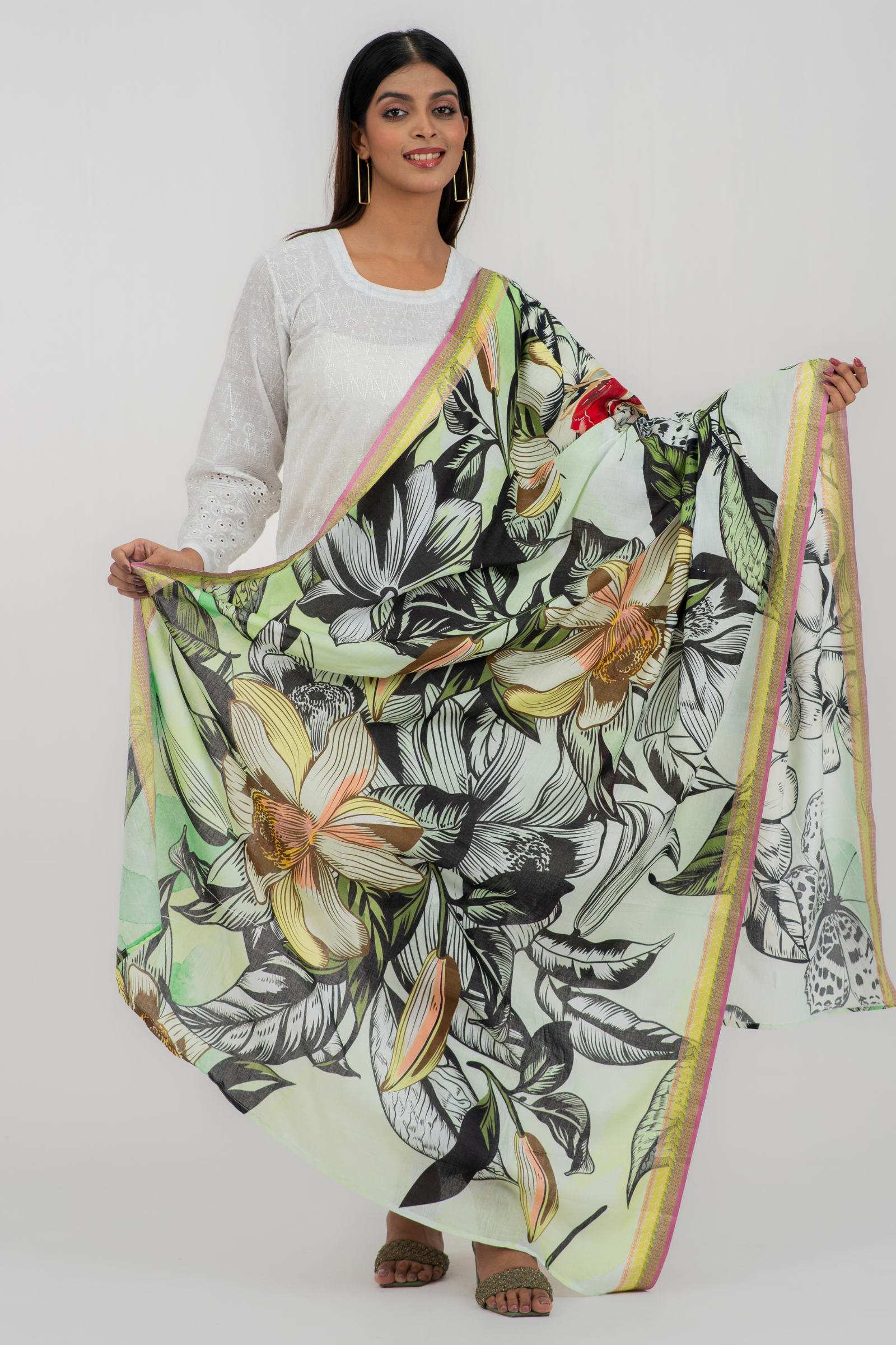 Gorgeous digitally printed orna on superfine tencel fabric with woven jacquard border.