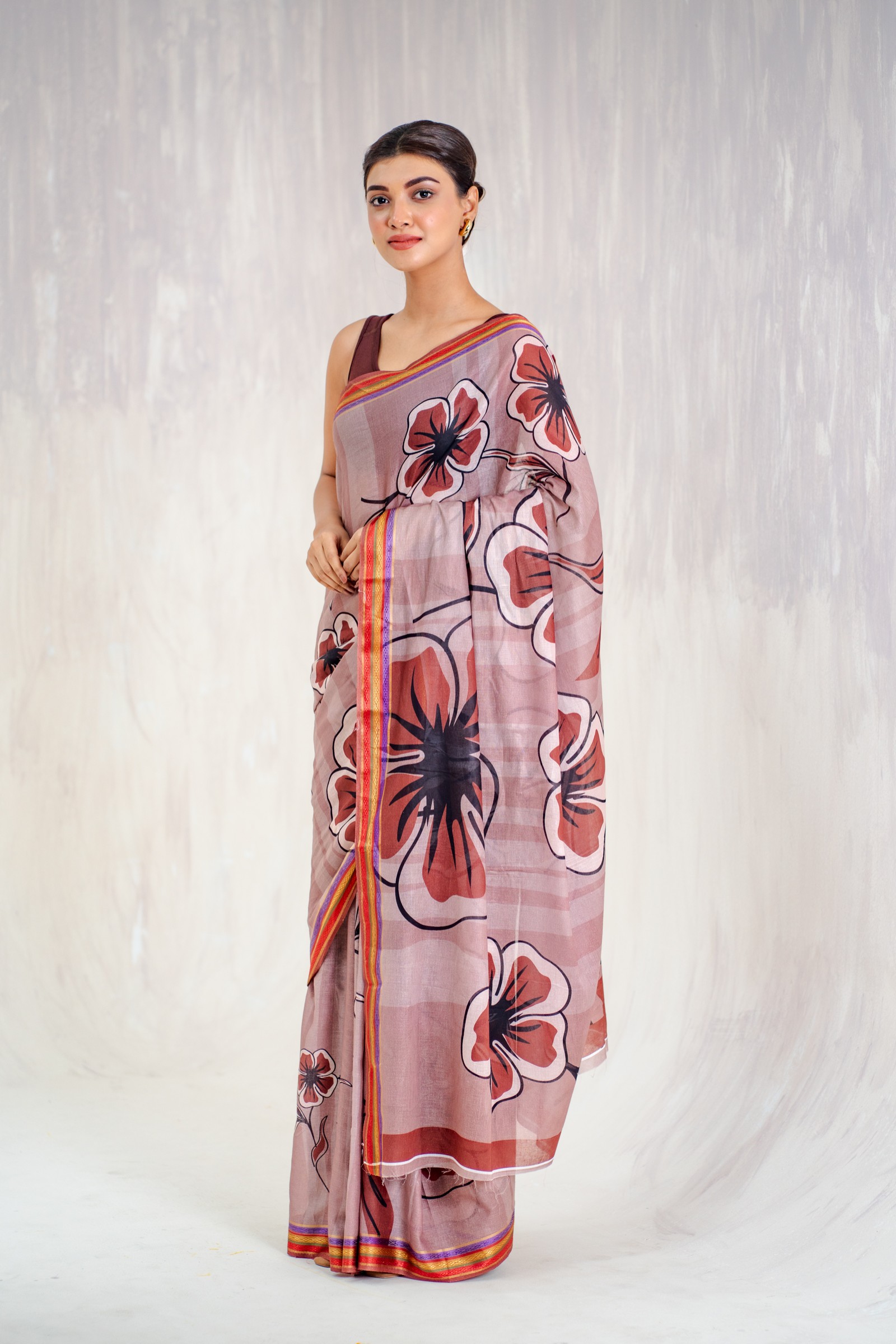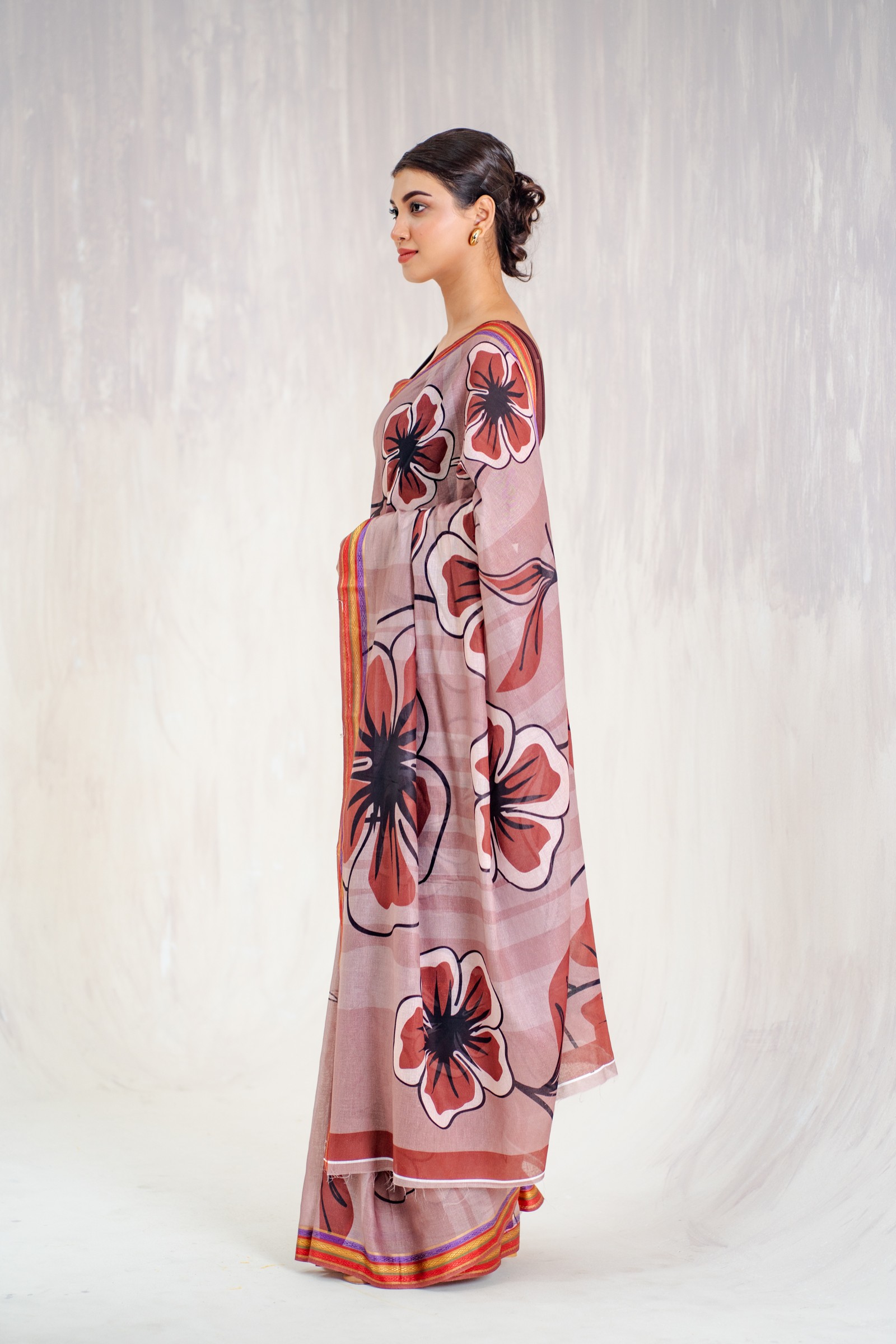 Description: Soft, mercerized cotton sari with vibrant digital printed design and woven taat border.