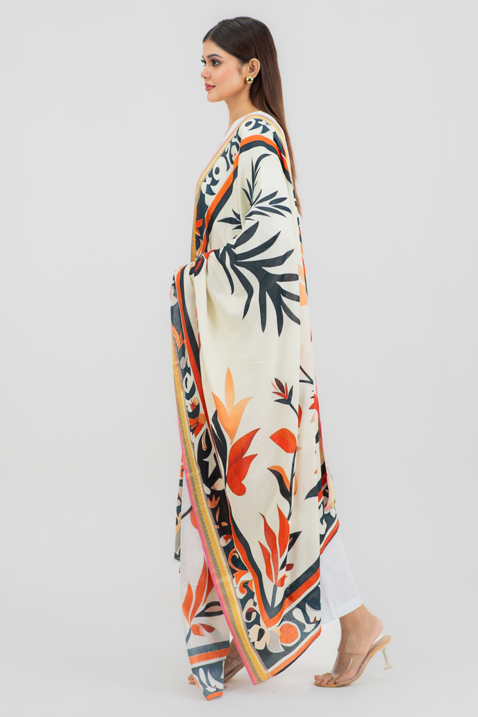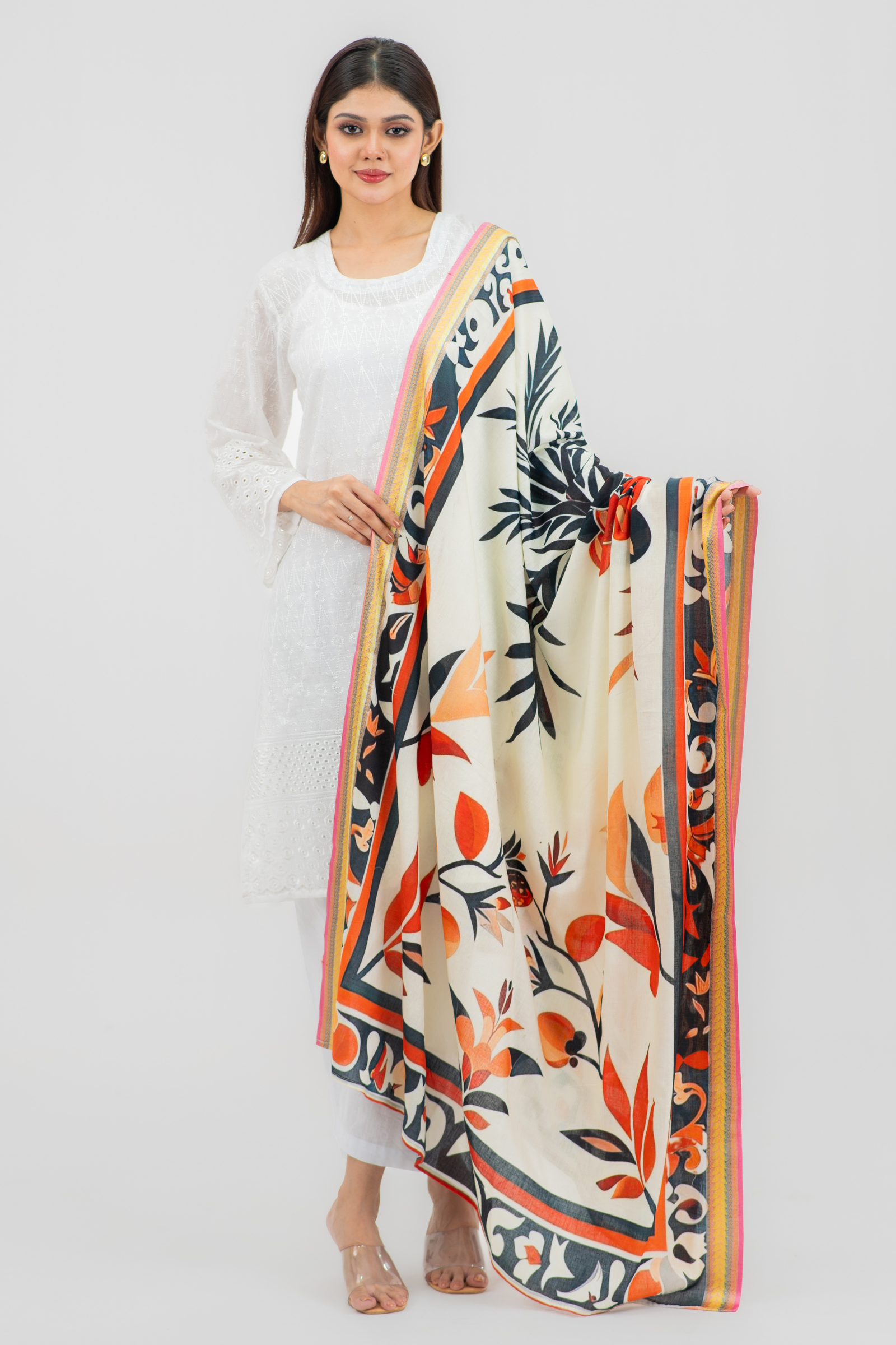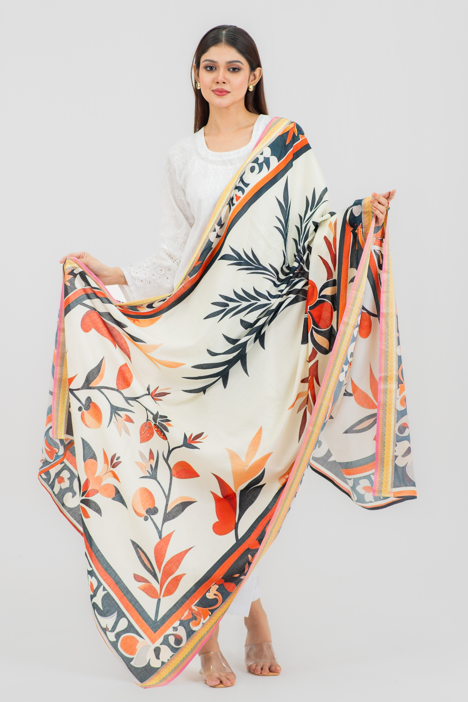 Gorgeous digitally printed orna on superfine tencel fabric with woven jacquard border.