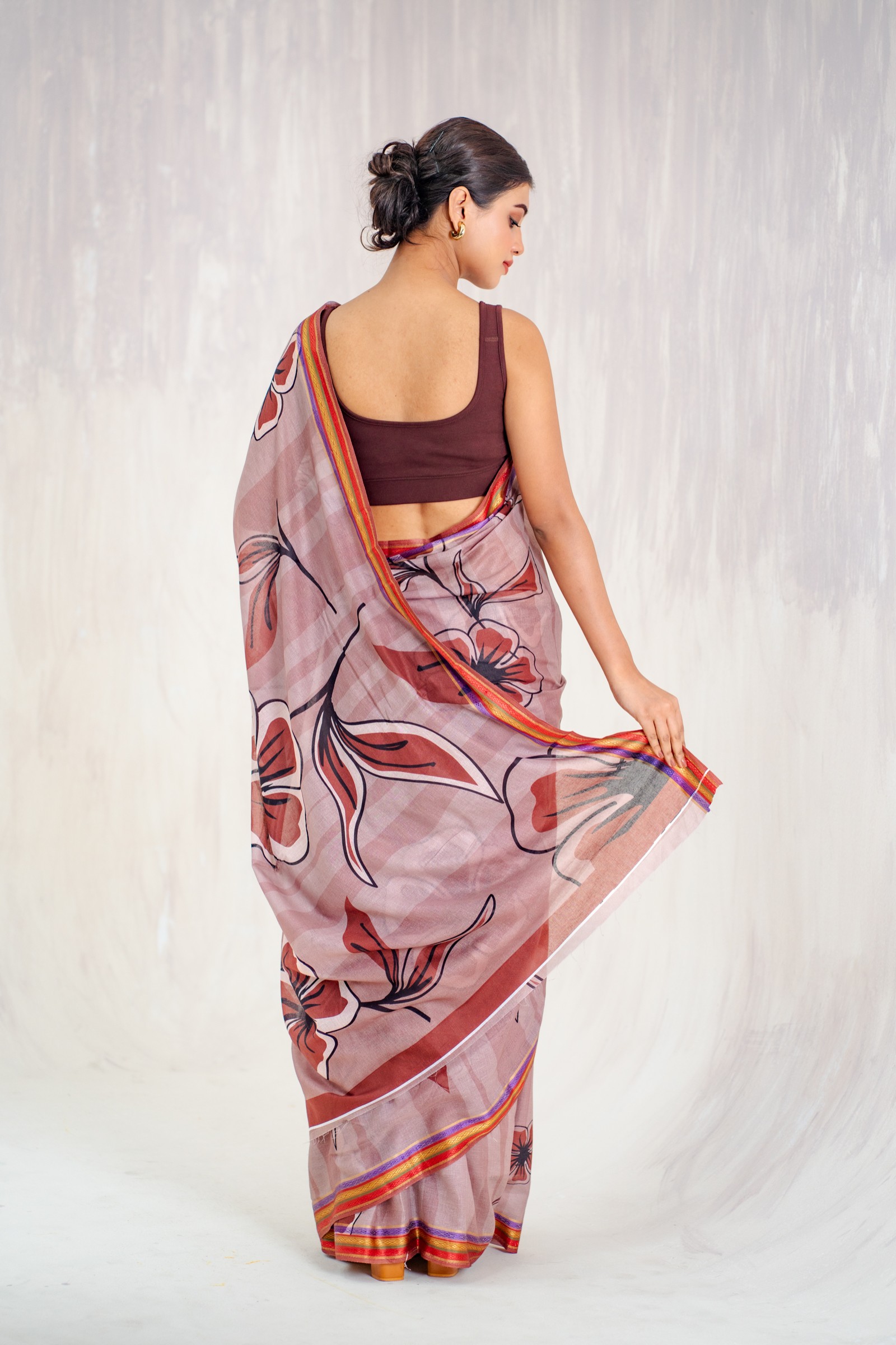 Description: Soft, mercerized cotton sari with vibrant digital printed design and woven taat border.