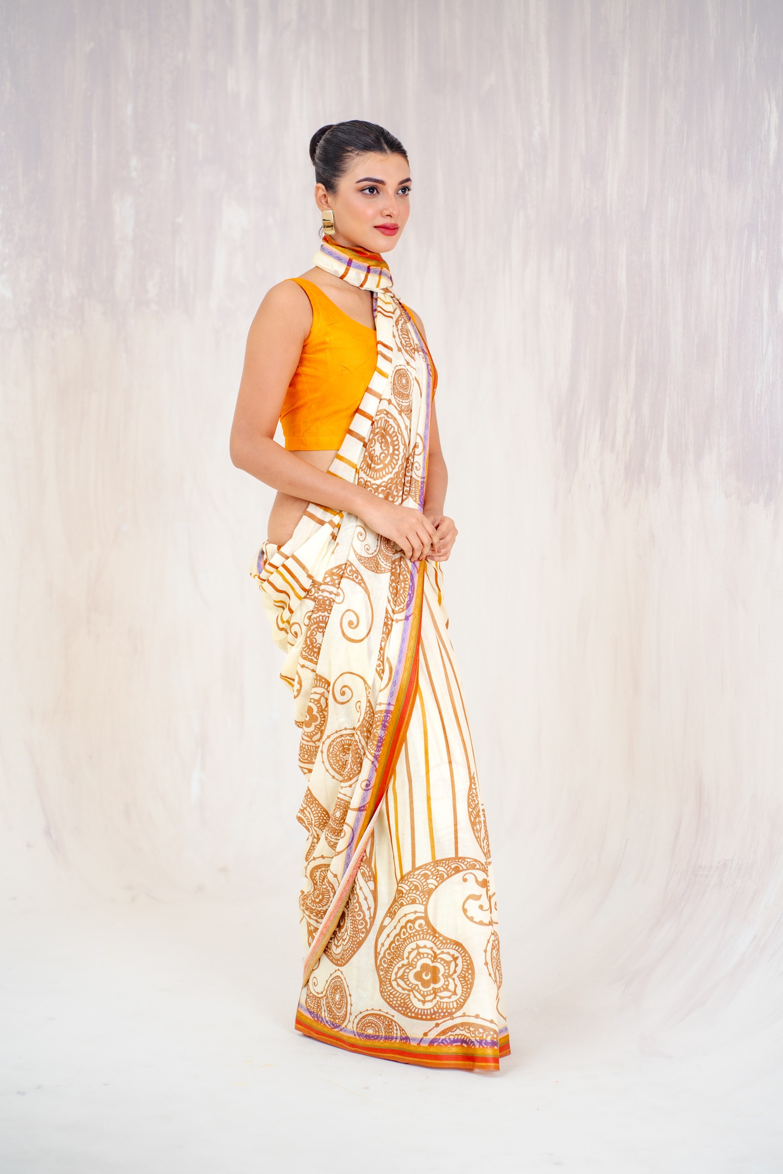 Technique: Digital Print | Jacquard Border Hem Description: Soft, mercerized cotton sari with vibrant digital printed design and woven taat border.